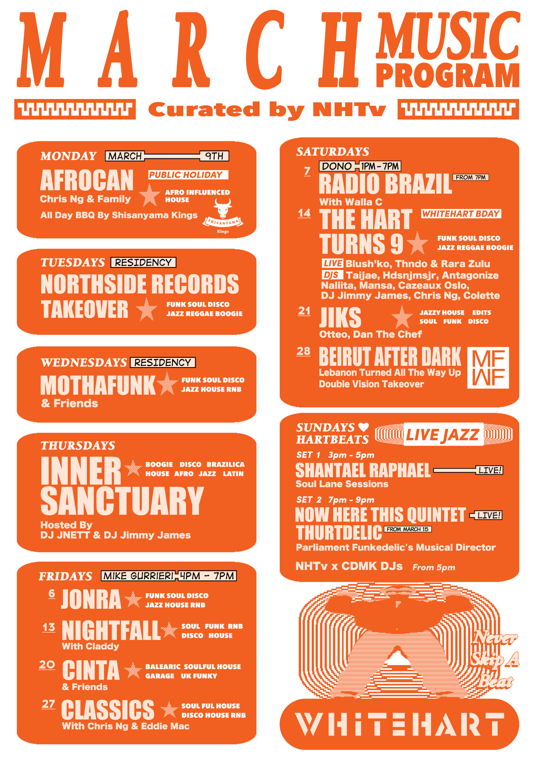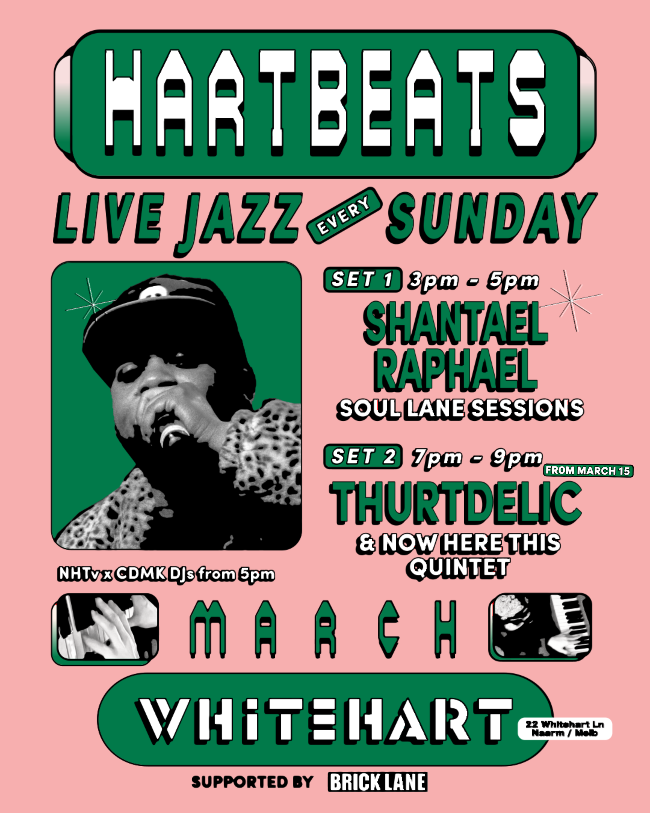 The perfect end to your weekend, only at Whitehart. Featuring a double whammy of Shantael Raphael’s Soul Lane Sessions and a set from Now Here This Quintet with Thurtdelic joining us from March 15.